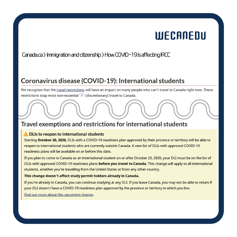 | Canada.ca > Immigration and citizenship > How COVID-19 is affecting IRCC >Coronavirus disease (COVID-19): International students DLIs to reopen to international students Starting October 20, 2020, DLIs with a COVID-19 readiness plan approved by their province or territory will be able to reopen to international students who are currently outside Canada. A new list of DLIs with approved COVID-19 readiness plans will be available on or before this date. If you plan to come to Canada as an international student on or after October 20, 2020, your DLI must be on the list of DLIs with approved COVID-19 readiness plans before you travel to Canada. This change will apply to all international students, whether you’re travelling from the United States or from any other country. This change doesn’t affect study permit holders already in Canada. If you’re already in Canada, you can continue studying at any DLI. If you leave Canada, you may not be able to return if your DLI doesn’t have a COVID-19 readiness plan approved by the province or territory in which you live. |