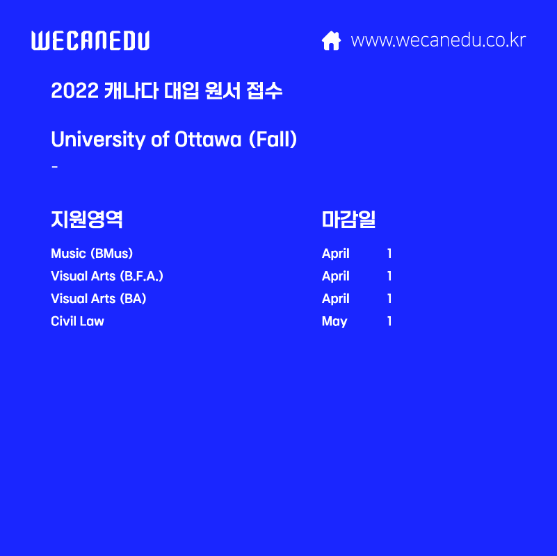 [대학유학] 2022년 캐나다 대학 입학 지원 마감 일정 - 2월 (0) | 2022.01.24 |