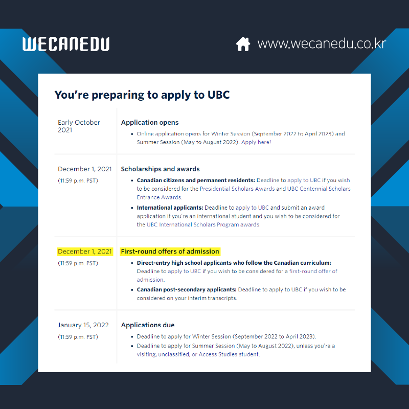 | [위캔에듀] 2022년 캐나다 대학교 원서 접수 일정 (각 대학별 일정)! (0) | 2021.12.27 |