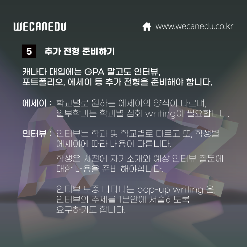 | [위캔에듀] 2022년 캐나다 대학교 원서 접수 일정 (각 대학별 일정)! (0) | 2021.12.27 |