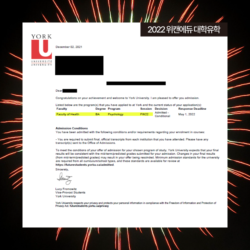 첫 합격자는 요크대학교 (York University) 에서 나왔습니다.