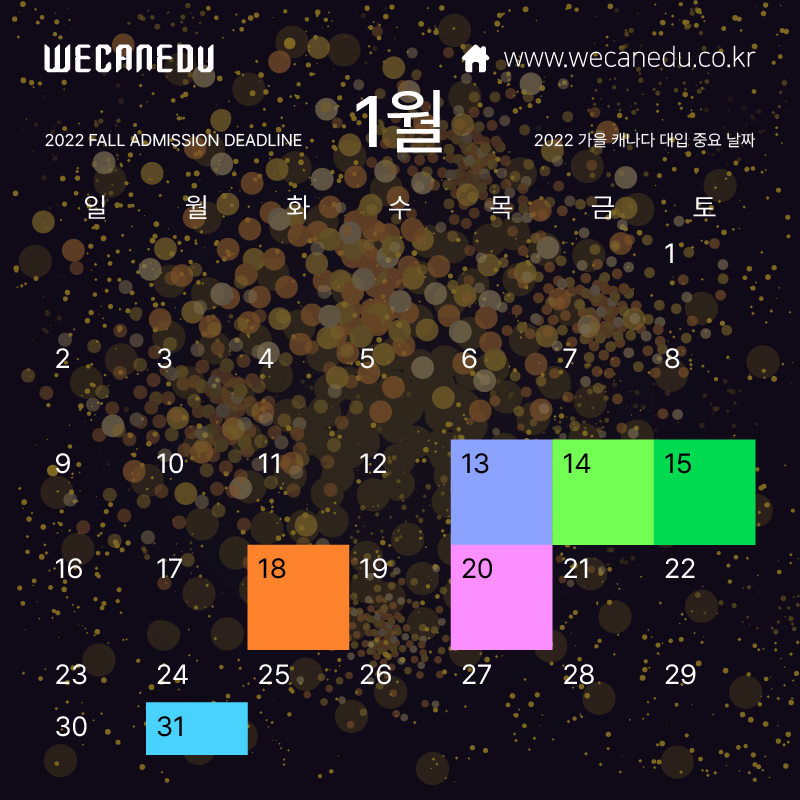 | [대학유학] 2022년 캐나다 대학 입학 지원 마감 일정 - 3월 (0) | 2022.01.18 |
