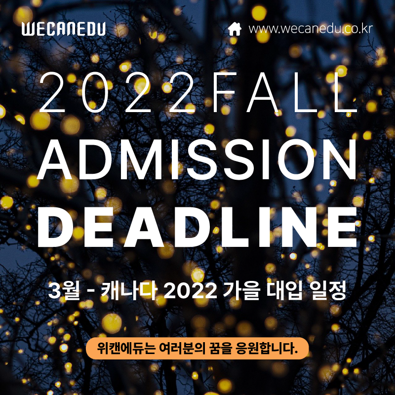 | [대학유학] 2022년 캐나다 대학 입학 지원 마감 일정 - 2월 (0) | 2022.01.24 |