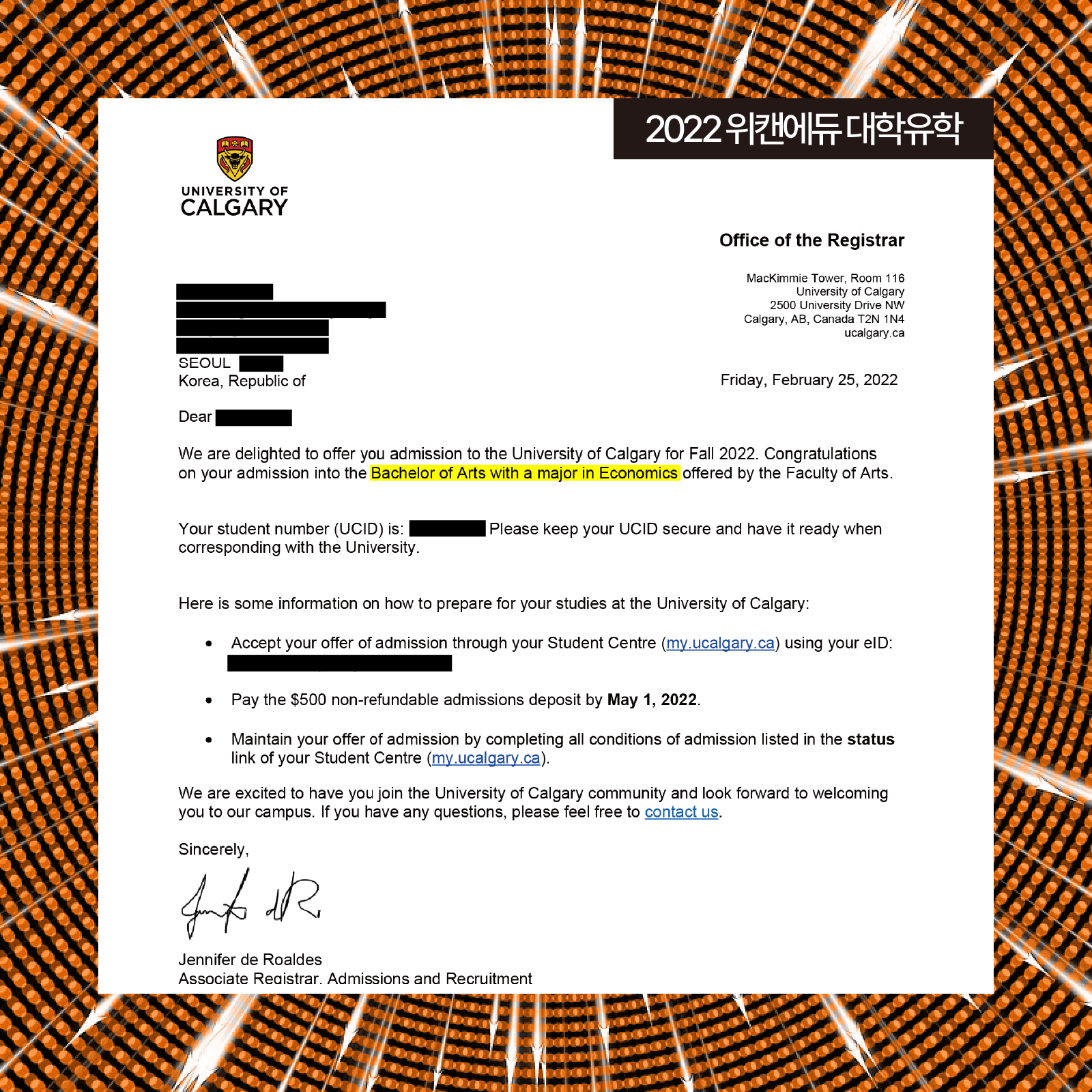 캐나다 최고의 명문대학 중 하나에 합격했습니다.