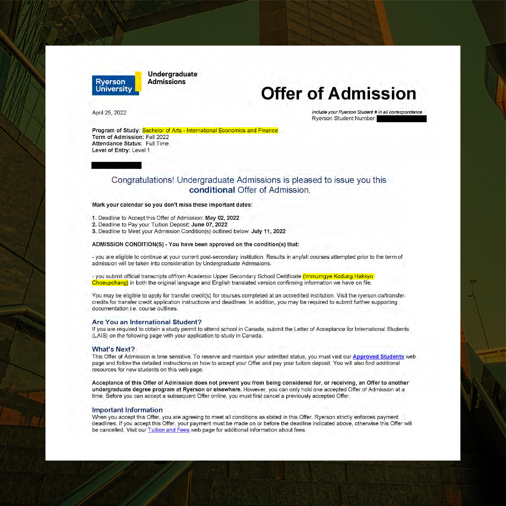 이번엔 Ryerson University 에서 합격소식이 왔습니다.