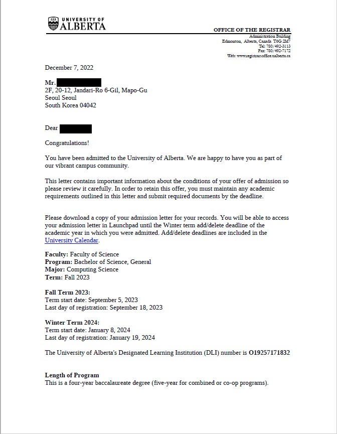 학생 이름으로 발급된 공식 Offer Letter만을