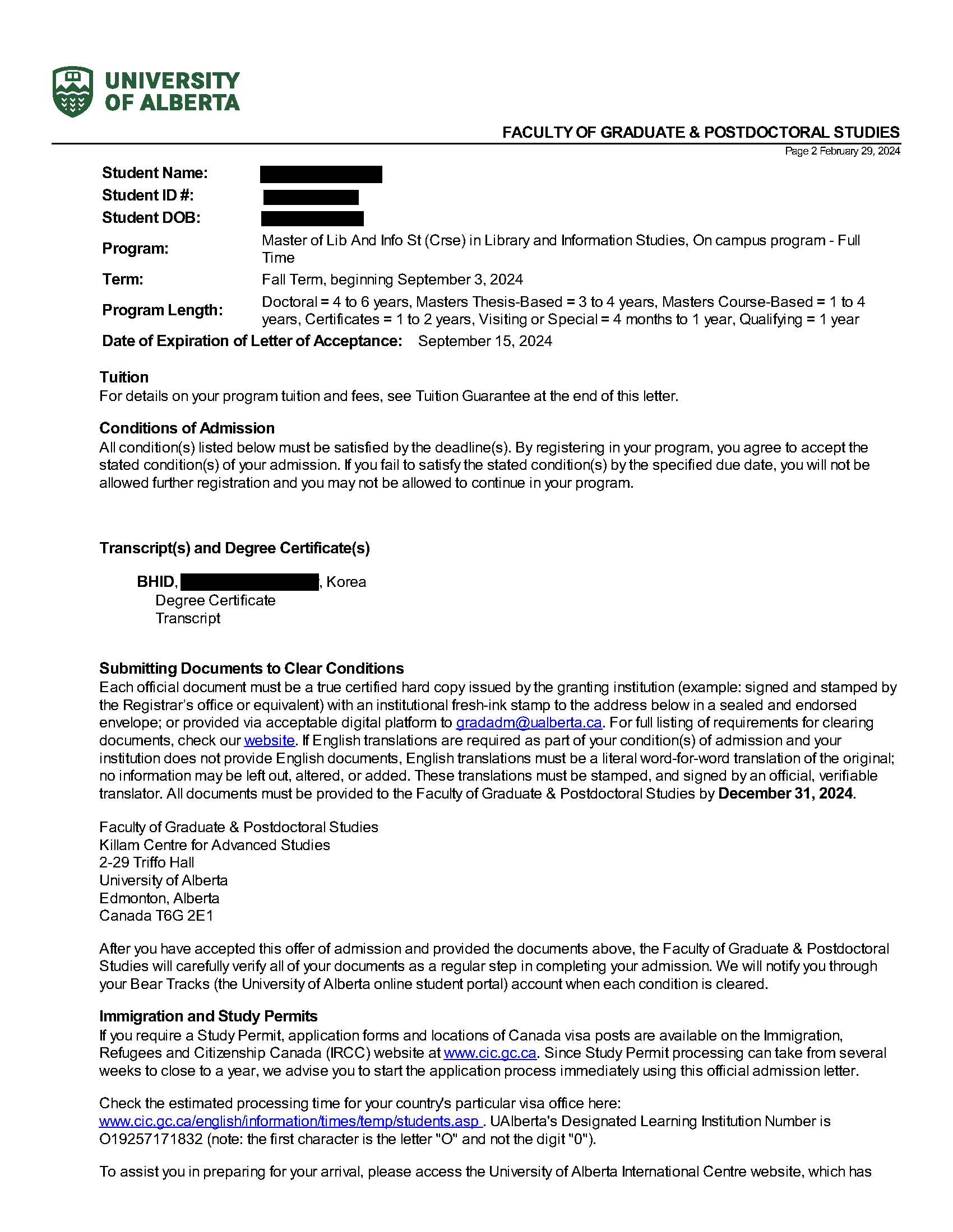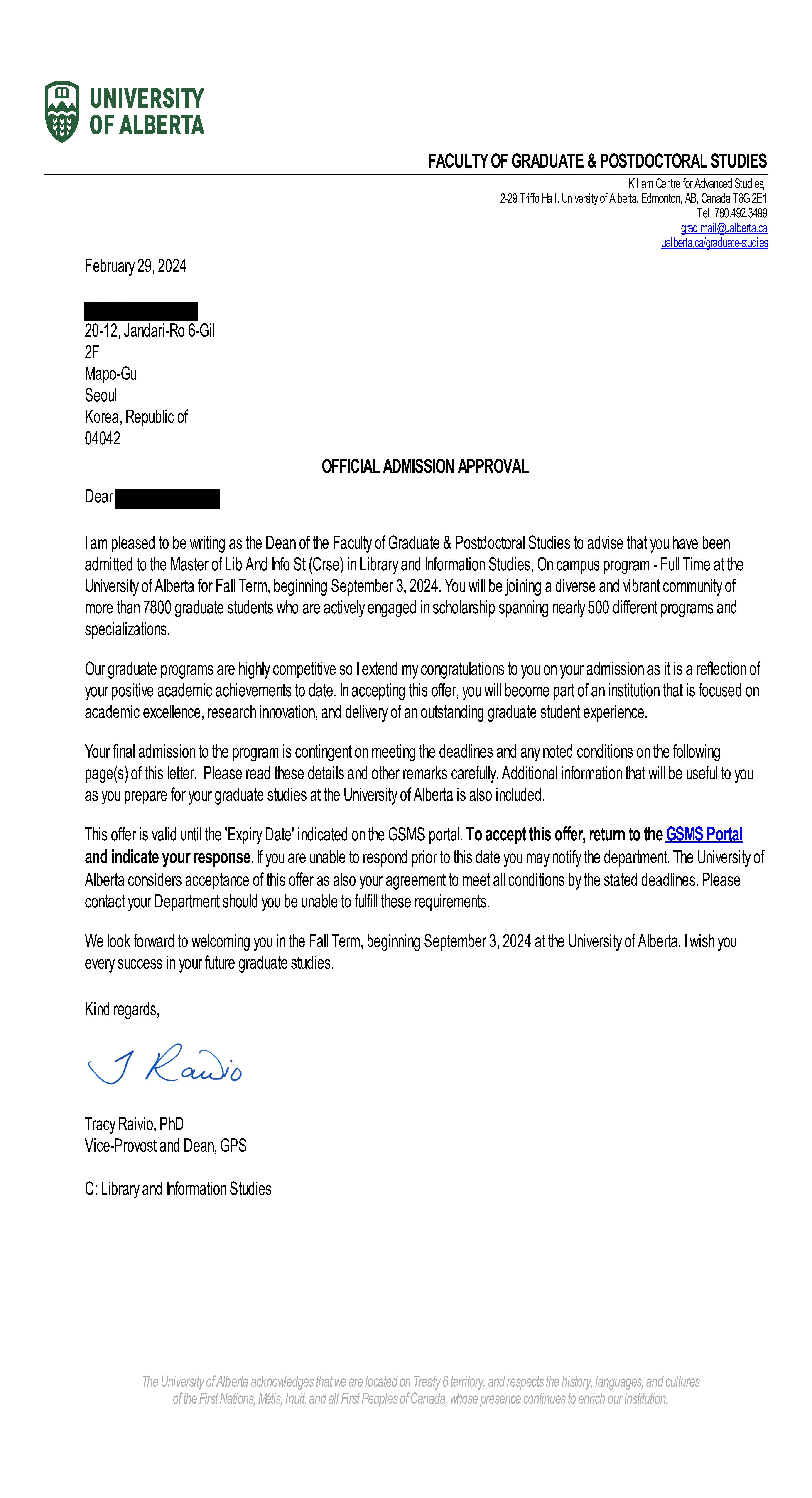 알버타 대학교에서 도착 합격소식입니다.