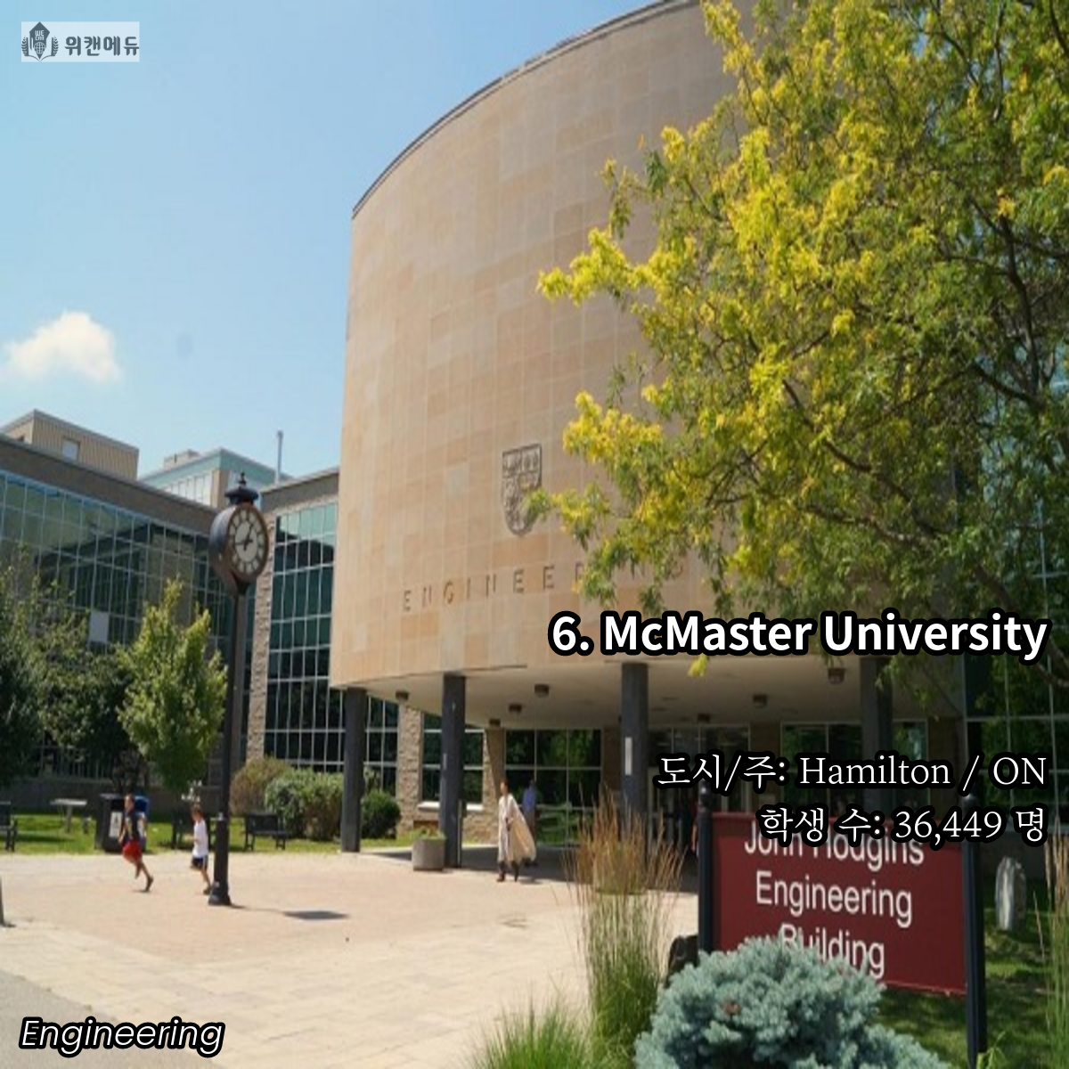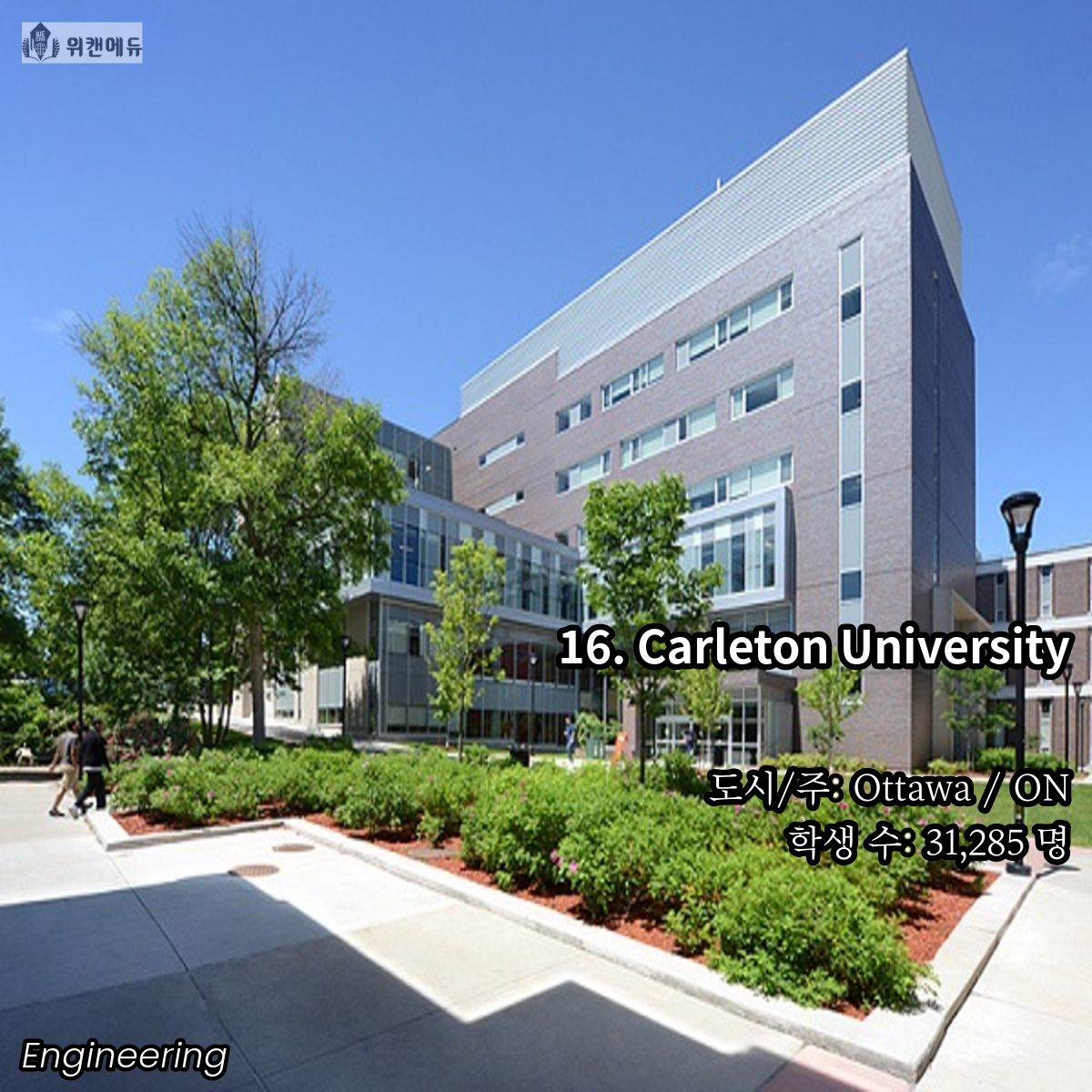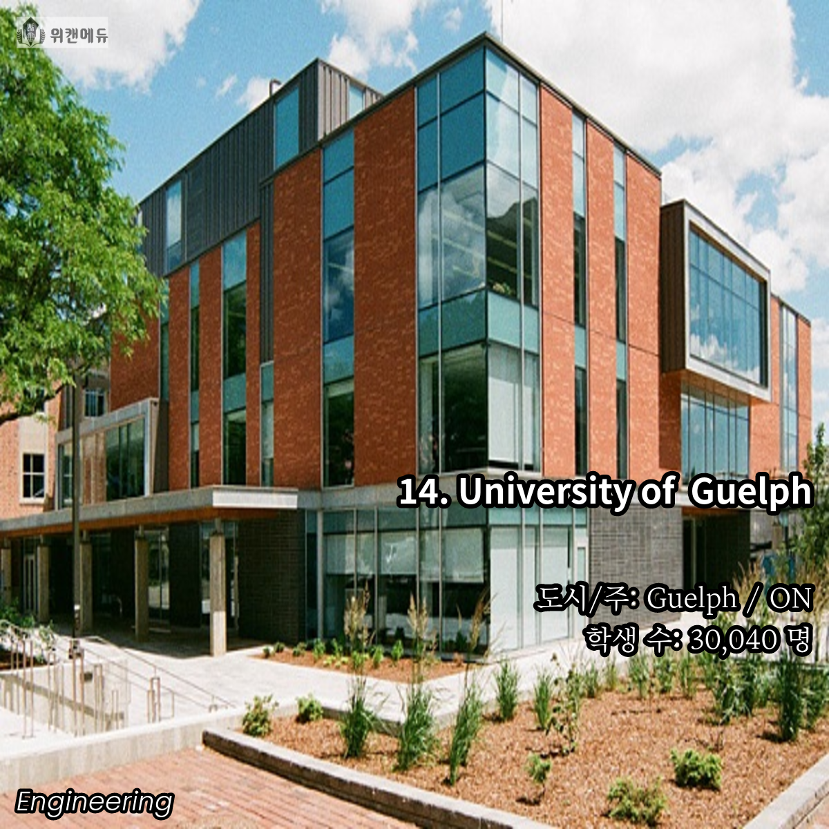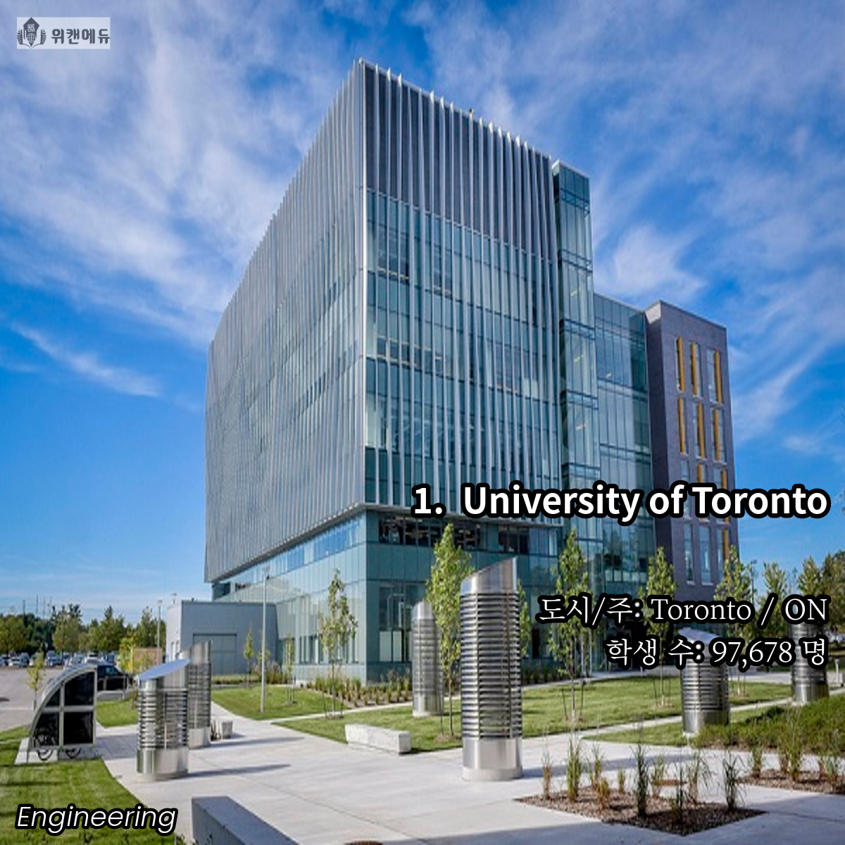 공학을 전공하고 싶은 학생들이라면 한 번 쯤은 꿈꿔보고 도전해볼 만한 곳이 바로 캐나다의 대학교 입니다. 세계 유수의 유명 대학들과 어깨를 나란히 하고, 필드 전반 곳곳에서 활약하는 인적 네트워크 등의 Background 역시 큰 자산이라고 할 수 있겠습니다.