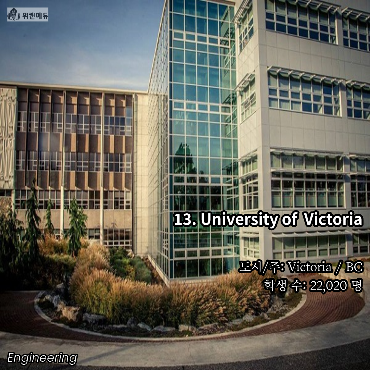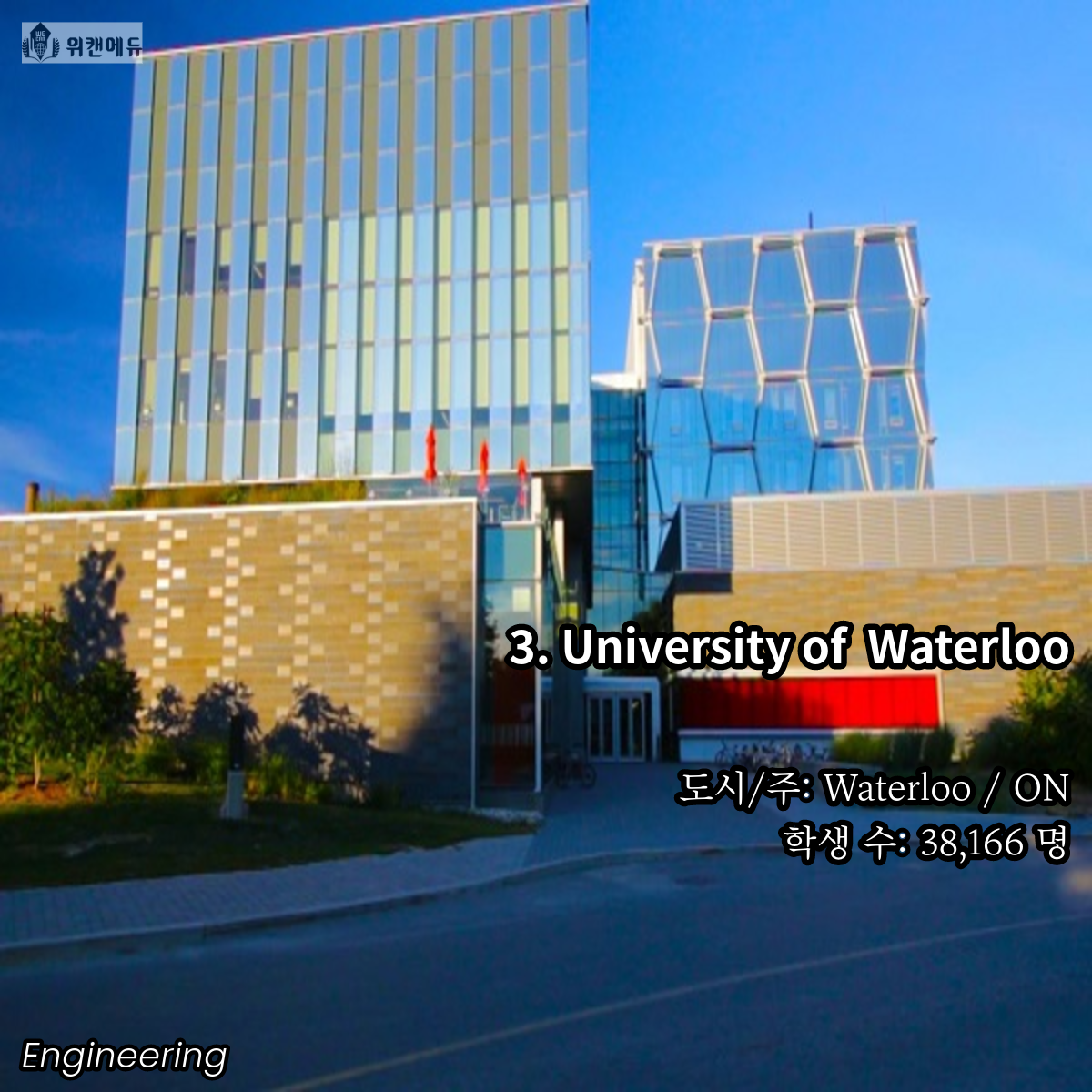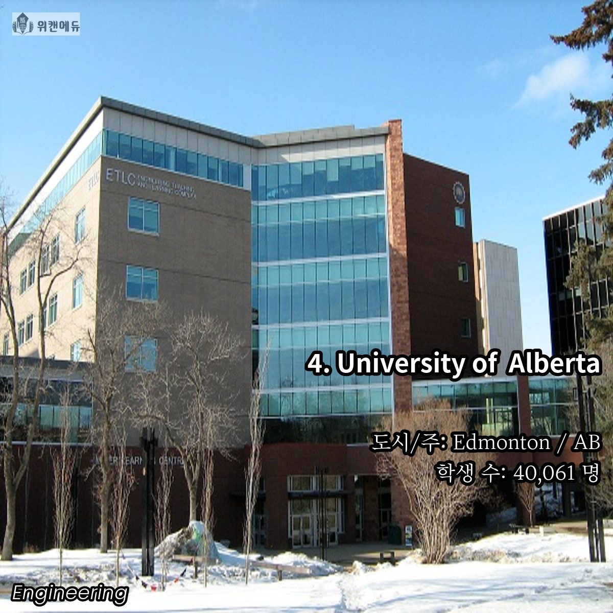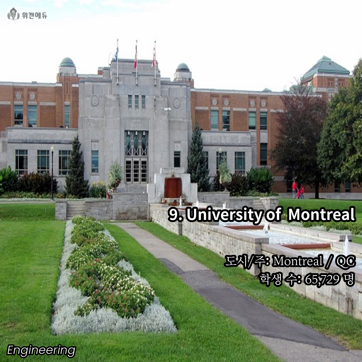 공학을 전공하고 싶은 학생들이라면 한 번 쯤은 꿈꿔보고 도전해볼 만한 곳이 바로 캐나다의 대학교 입니다. 세계 유수의 유명 대학들과 어깨를 나란히 하고, 필드 전반 곳곳에서 활약하는 인적 네트워크 등의 Background 역시 큰 자산이라고 할 수 있겠습니다.