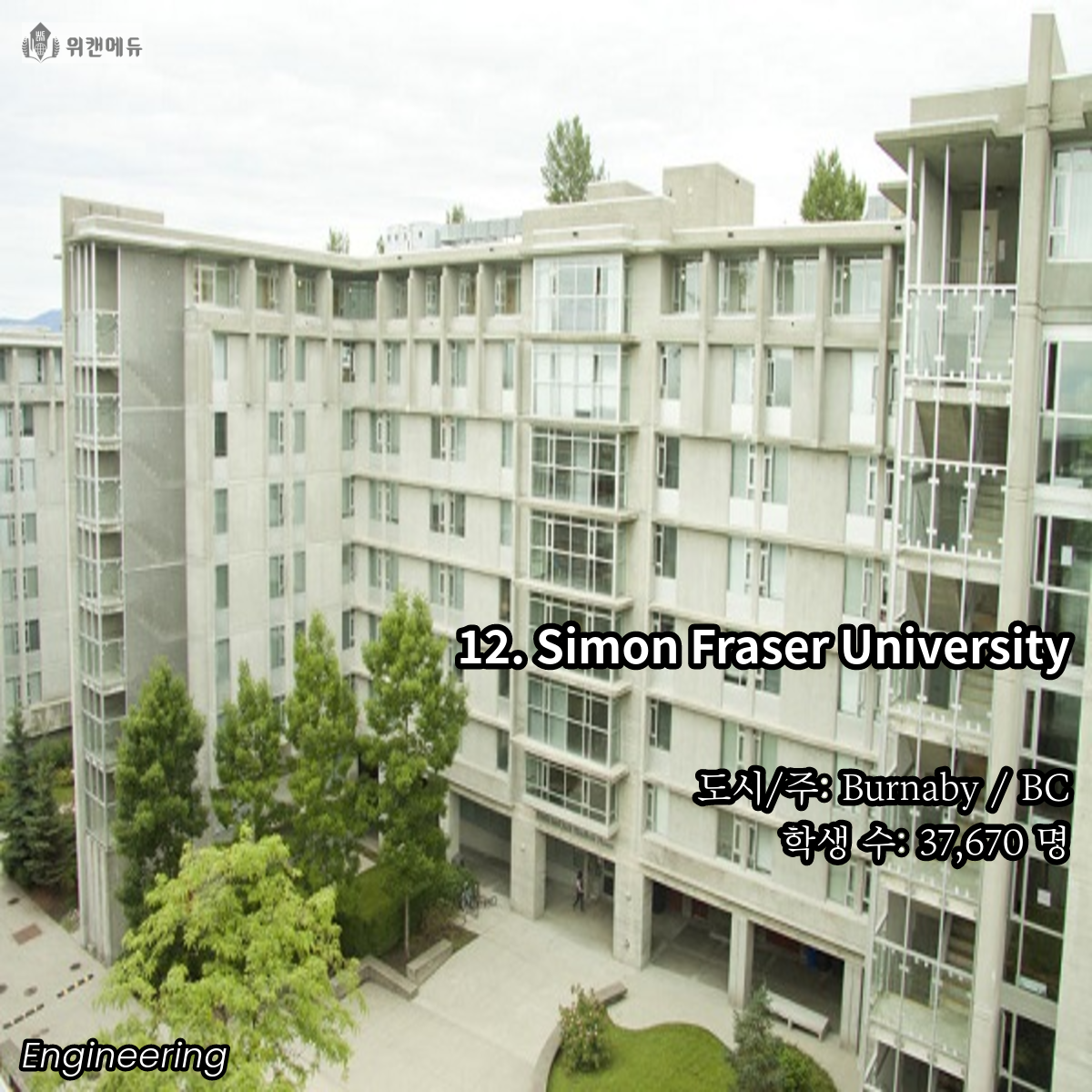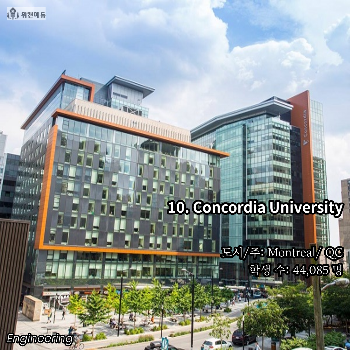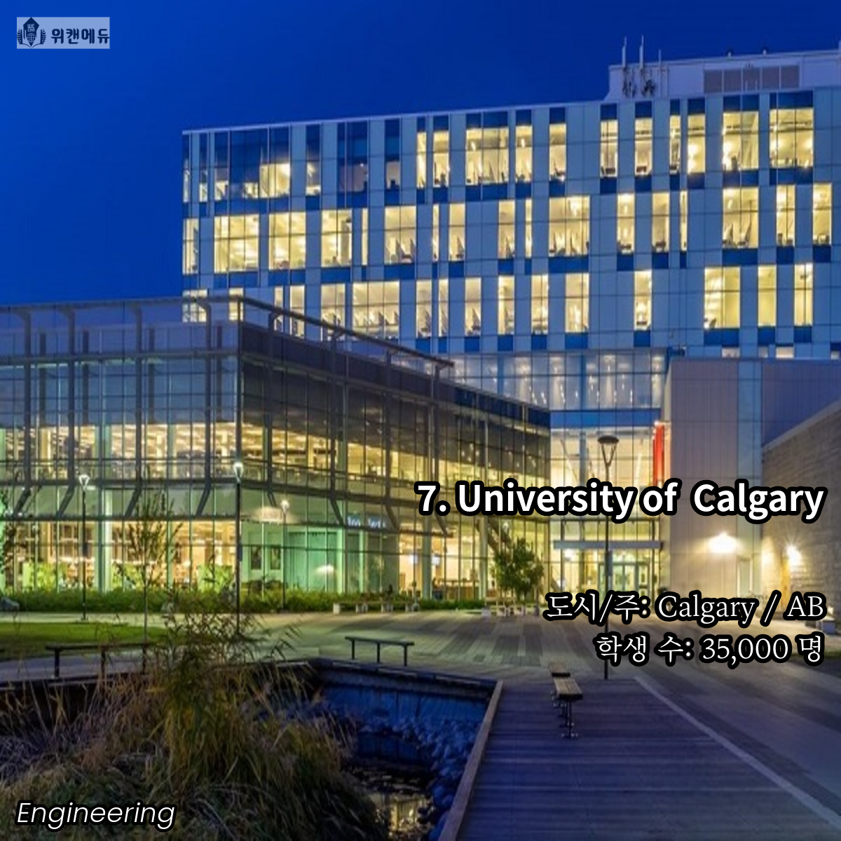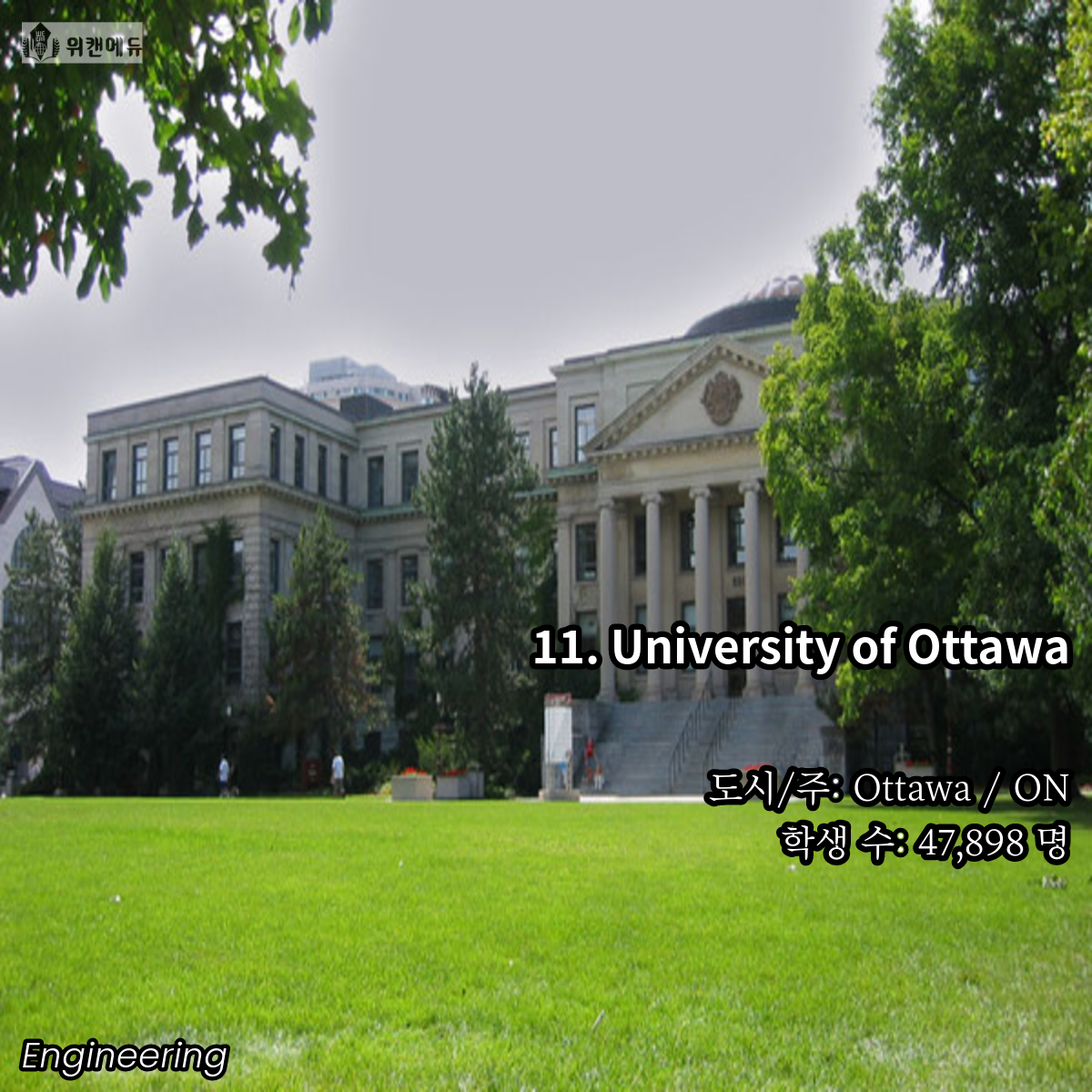 공학을 전공하고 싶은 학생들이라면 한 번 쯤은 꿈꿔보고 도전해볼 만한 곳이 바로 캐나다의 대학교 입니다. 세계 유수의 유명 대학들과 어깨를 나란히 하고, 필드 전반 곳곳에서 활약하는 인적 네트워크 등의 Background 역시 큰 자산이라고 할 수 있겠습니다.