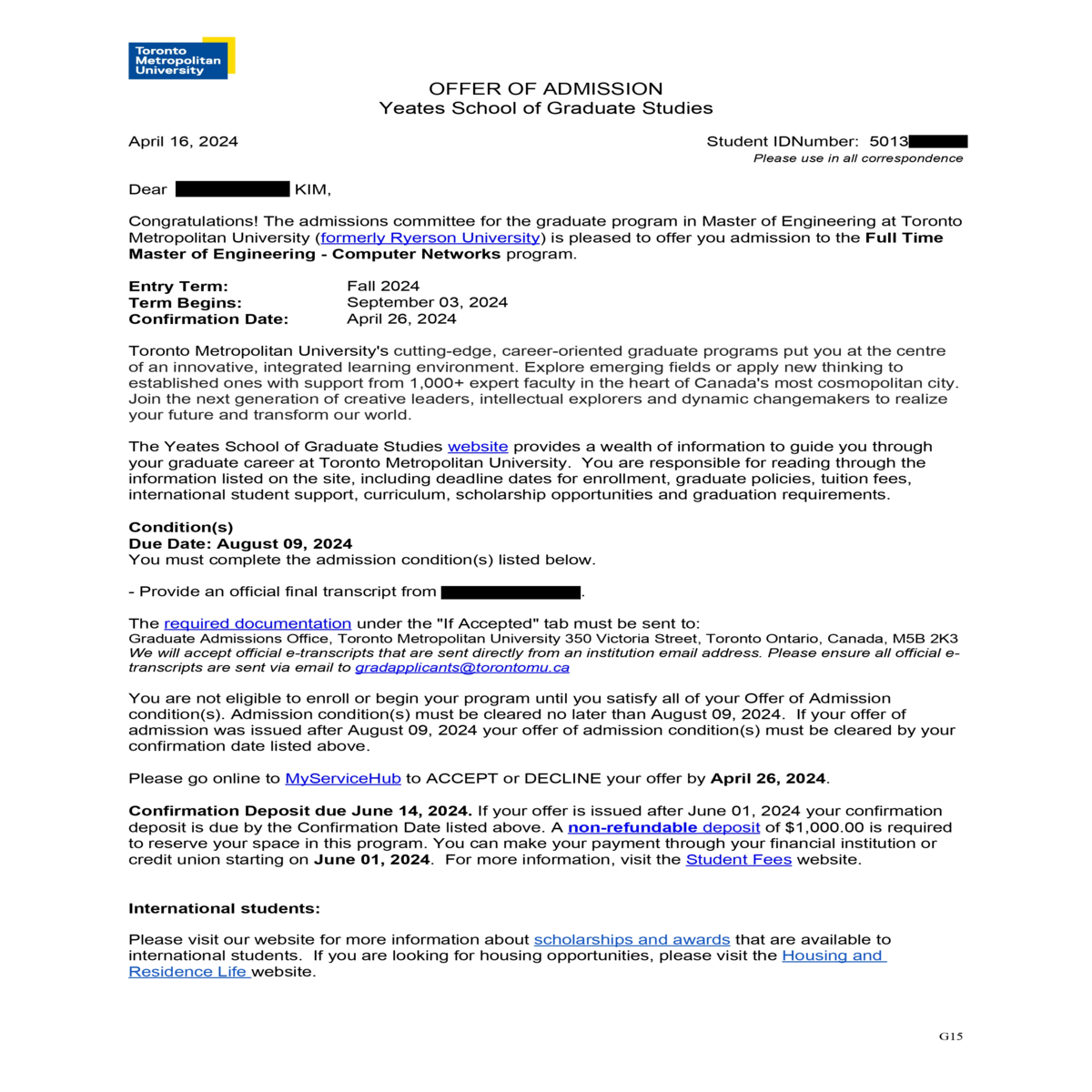 TMU에서 대학원 합격 소식이 도착했습니다.