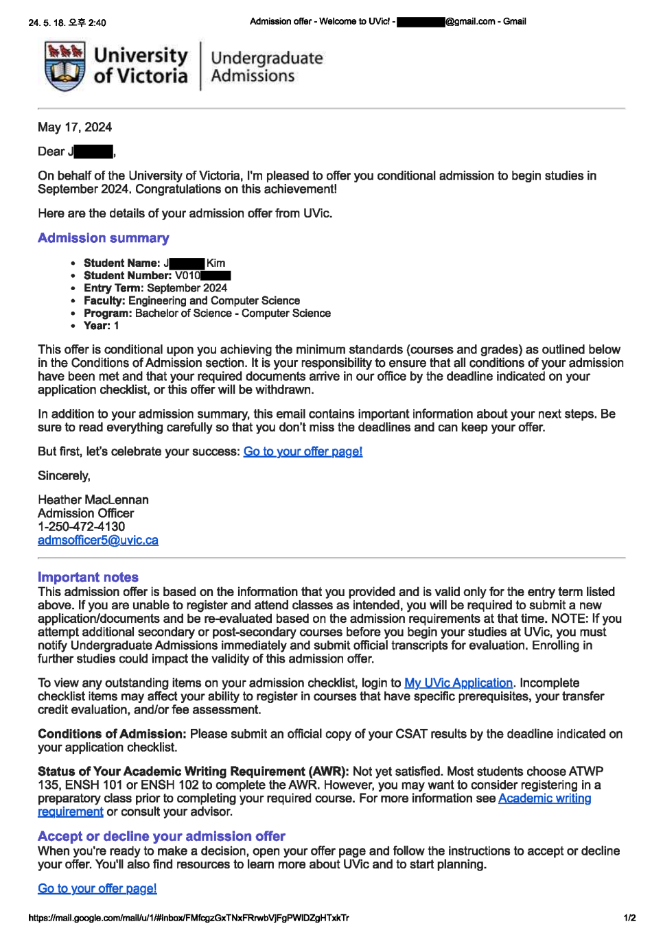 자, 그럼 합격 레터 한 번 확인해보겠습니다.
