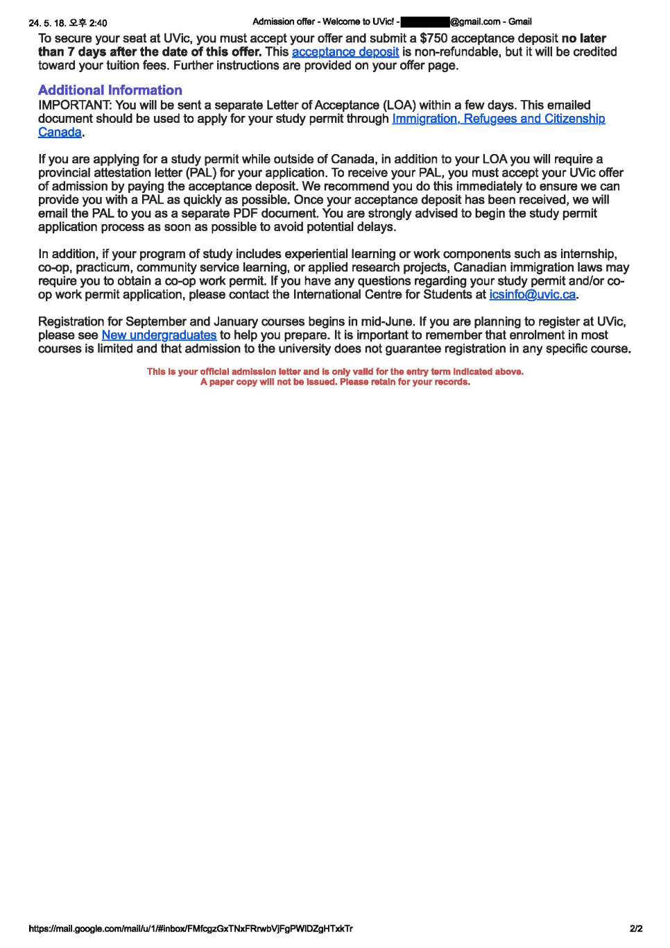 학생 이름으로 발급된 공식 Offer Letter만을