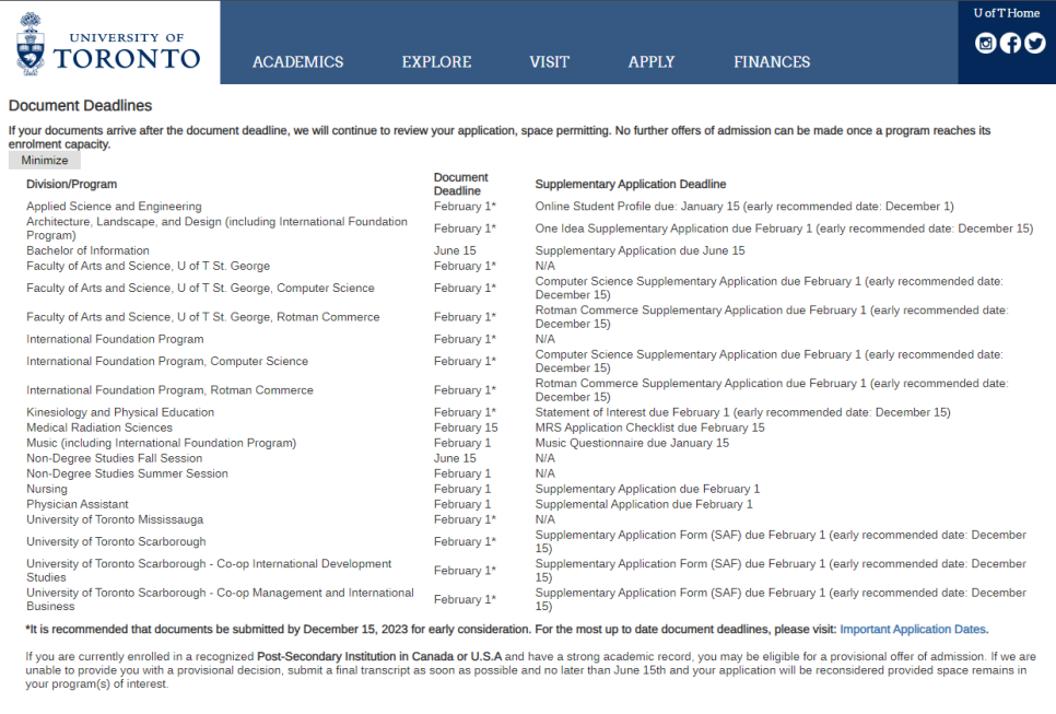 토론토 대학교의 입학 일정입니다.