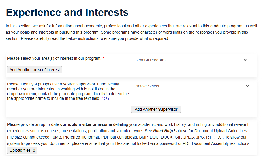 기본적인 UBC 석사 프로그램 지원 섹션인데요,