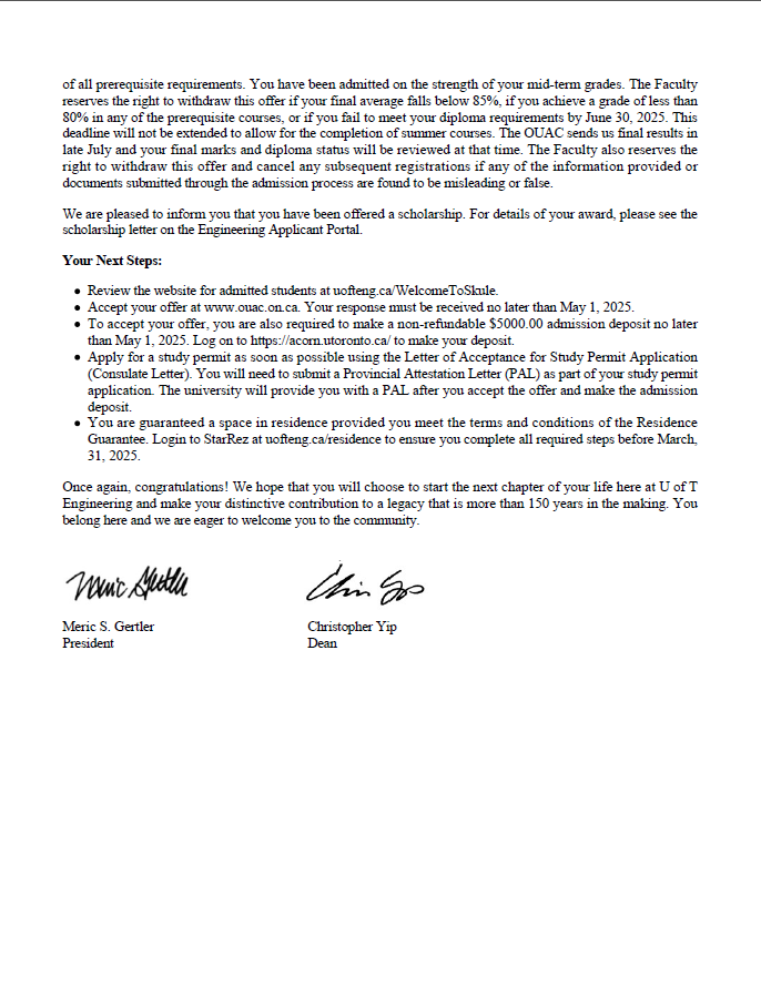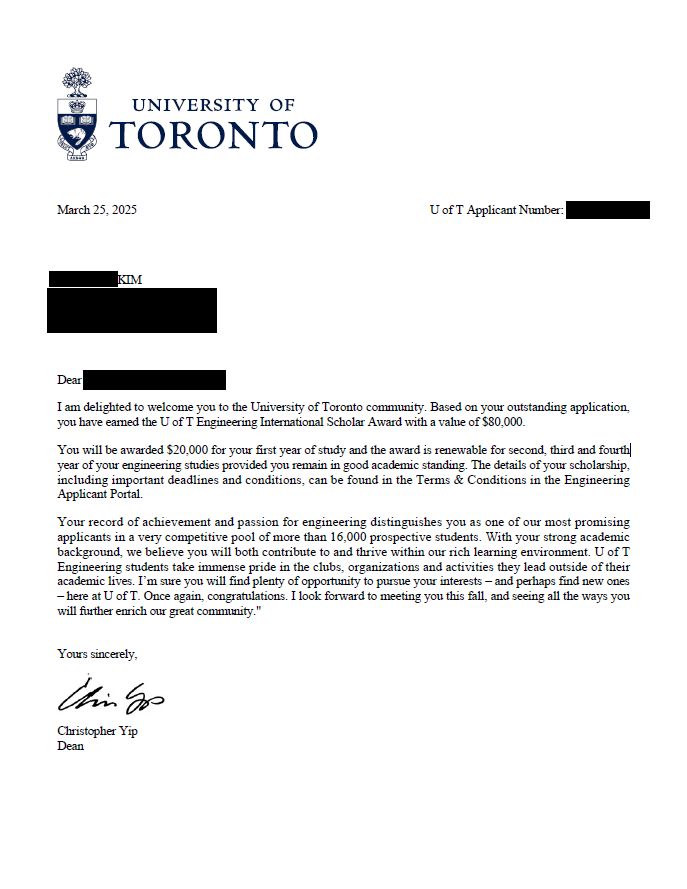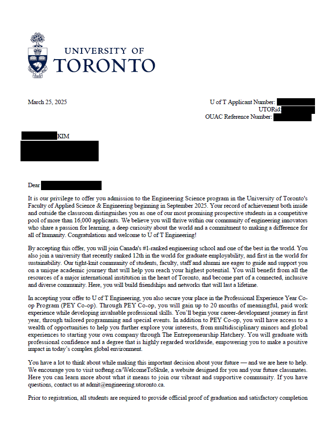 토론토 대학교에서 벌써 두 번째 합격입니다.