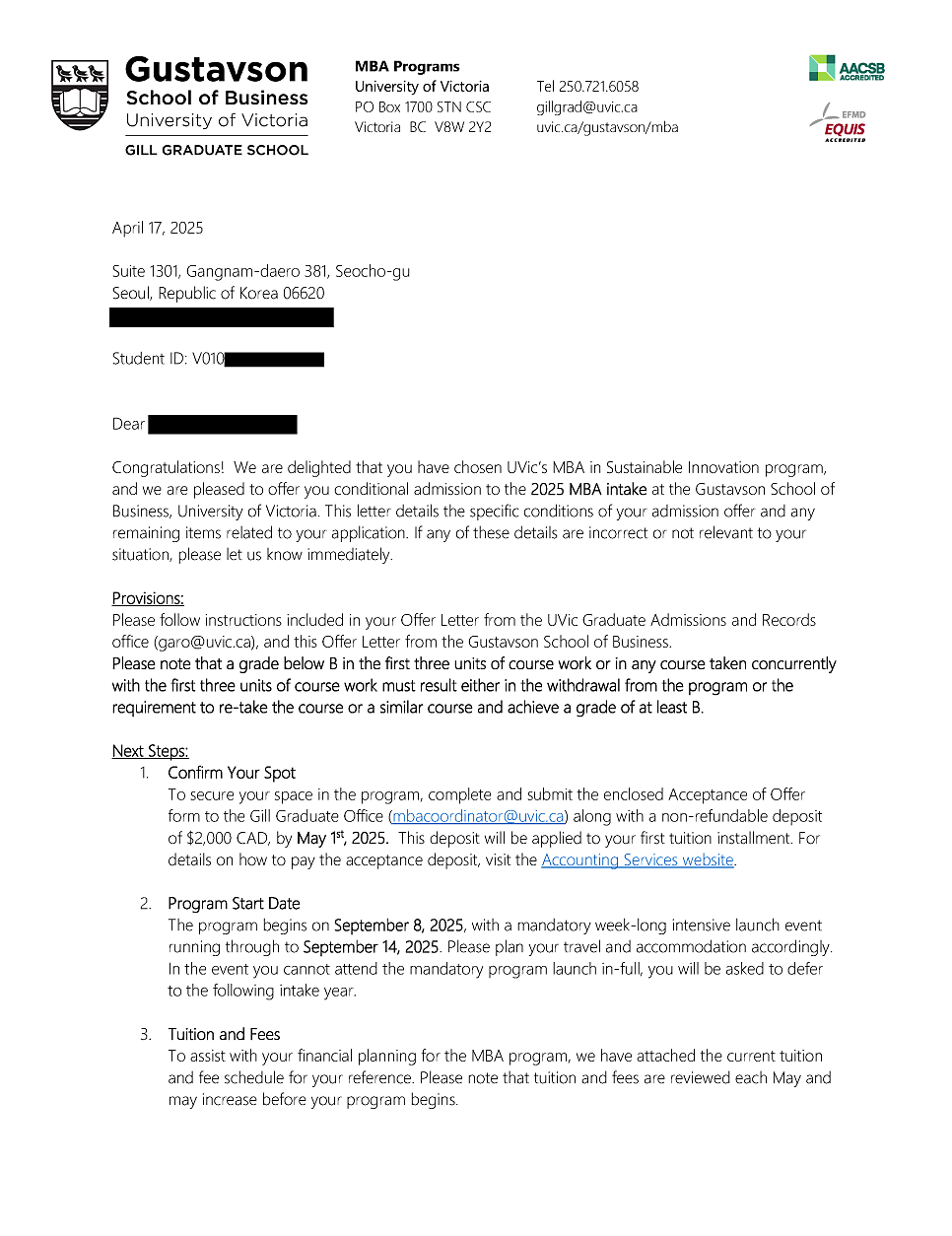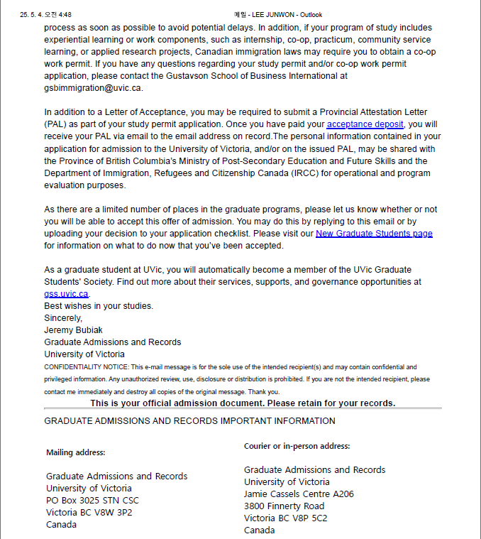 UVic은 합격증을 이메일 형태로 보내줍니다.